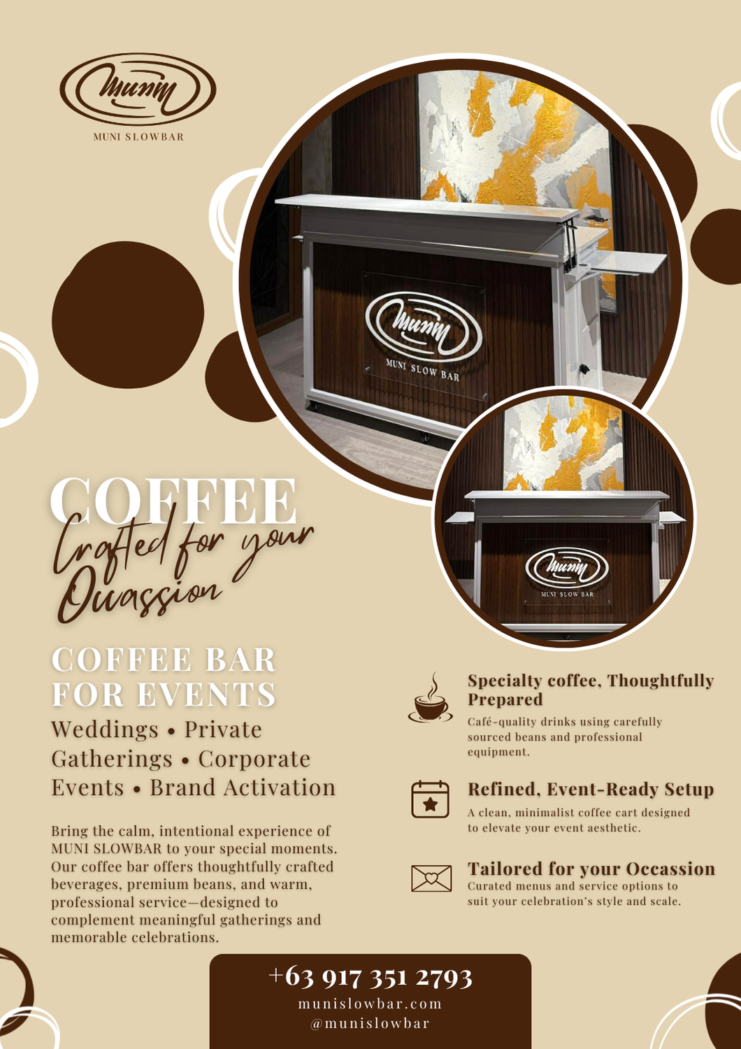 Bring the calm, intentional experience of MUNI SLOWBAR to your special moments. Our coffee bar offers thoughtfully crafted beverages, premium beans, and warm, professional service—designed to complement meaningful gatherings and memorable celebrations.